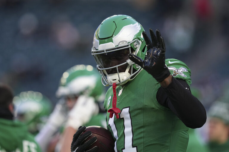 PHILADELPHIA, PENNSYLVANIA – JANUARY 4: A.J. Brown #11 of the Philadelphia Eagles acknowledges the crowd prior to the game against the Washington Commanders at Lincoln Financial Field on January 4, 2026 in Philadelphia, United States. (Photo by Mitchell Leff/Getty Images) | Getty Images Eagles Question of the Day: If the